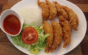 Små forårsruller med hakkede rejer, svinekød, krabbekød og grøntsager. Med sur/sød sovs.