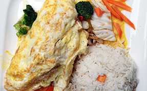 Æg, ærter, majs og gulerødder. Vælg mellem soya eller karry.