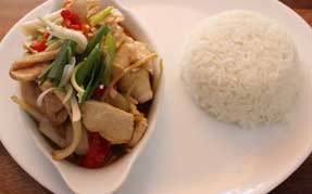 Med peberfrugt, løg, hvidkål, citronblade og rød karry. Serveres med ris. Kan gøres vegansk.