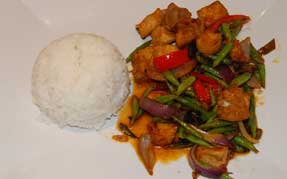 Med lange bønner, løg, peberfrugt, basilikum og ris.
